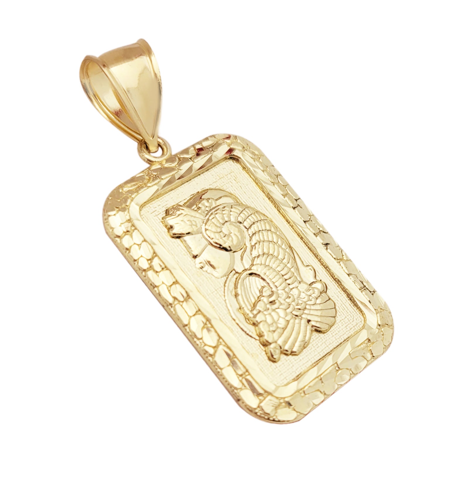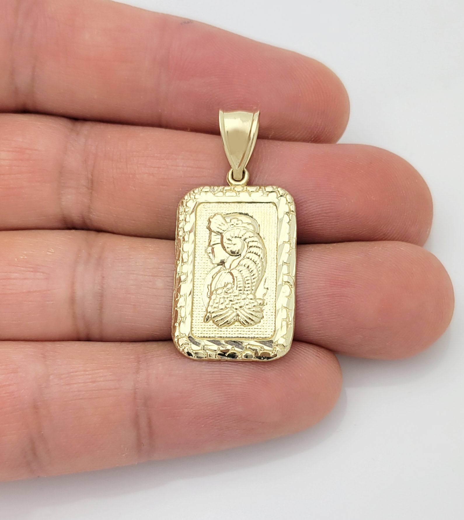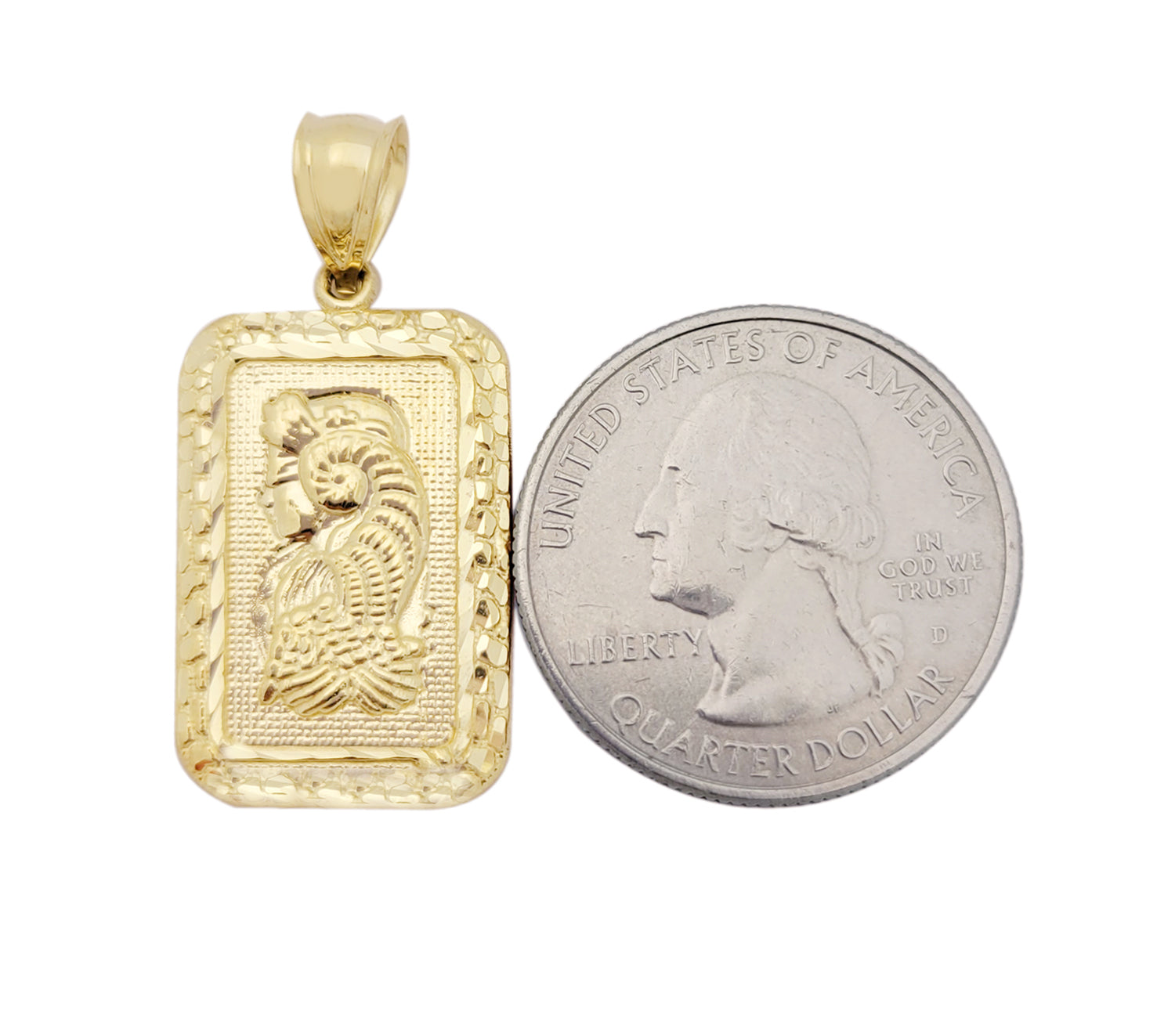 10k Yellow Gold Lady Fortuna Necklace Pendant Nugget Cut Frame Lady Fortuna Bar 1.25 inch