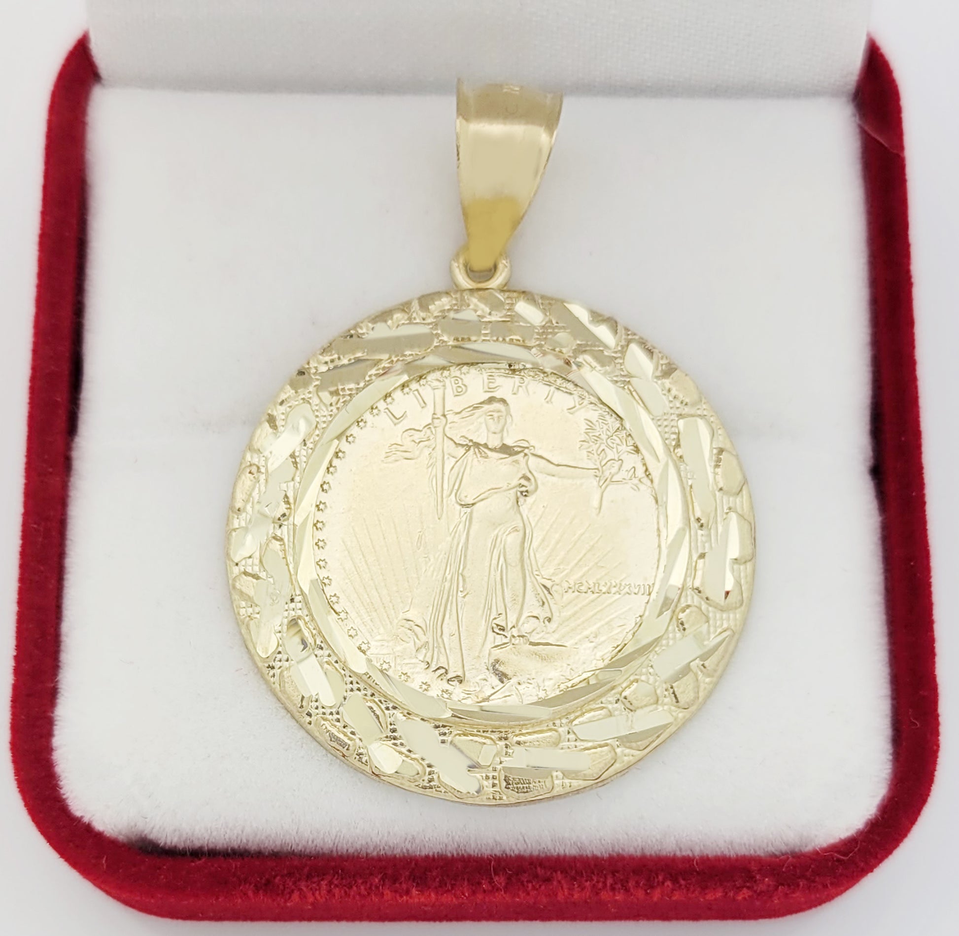 10K Yellow Gold Mens Walking Liberty Coin And Bezel Pendant 1.2 inch Diameter Medallion