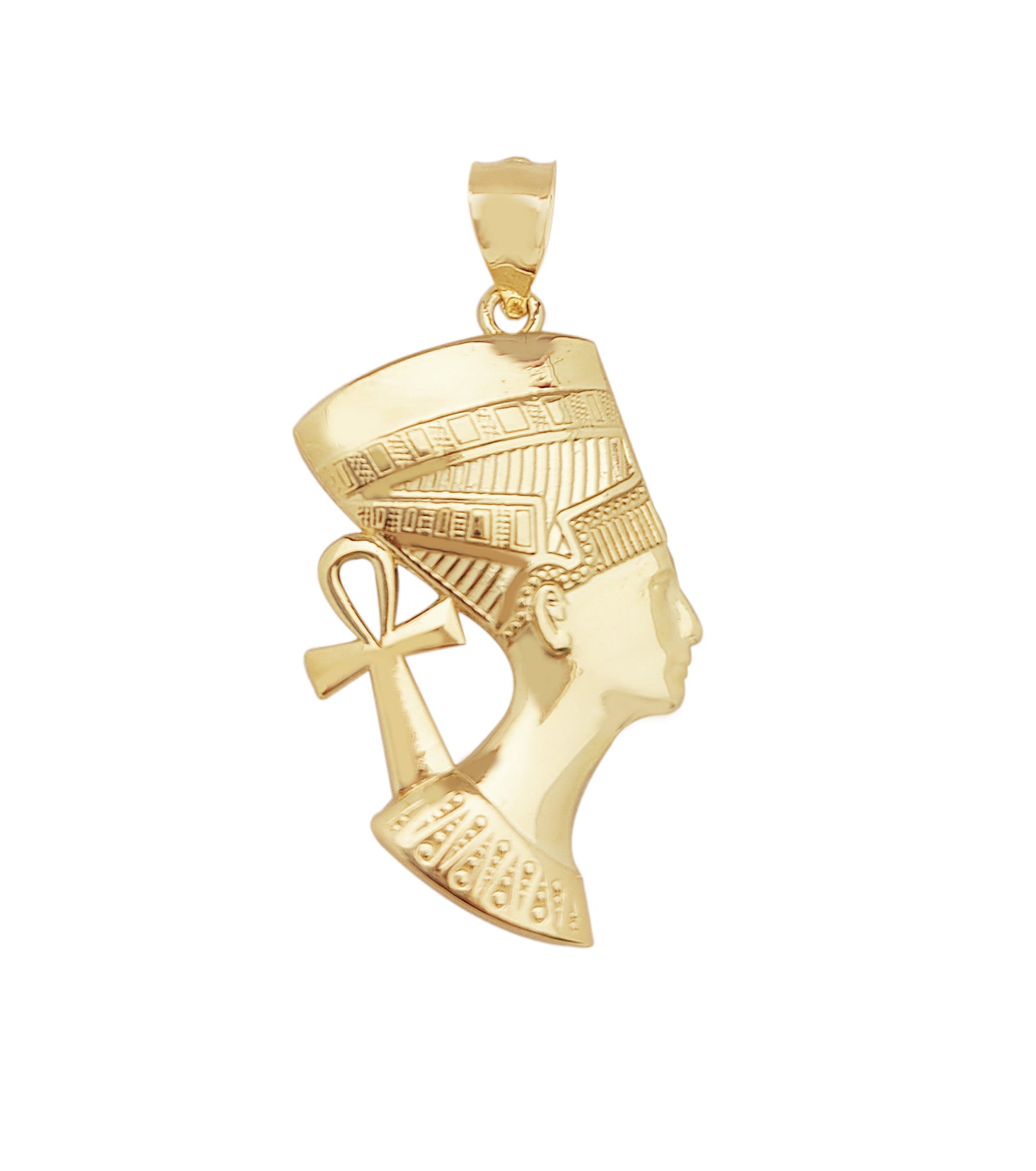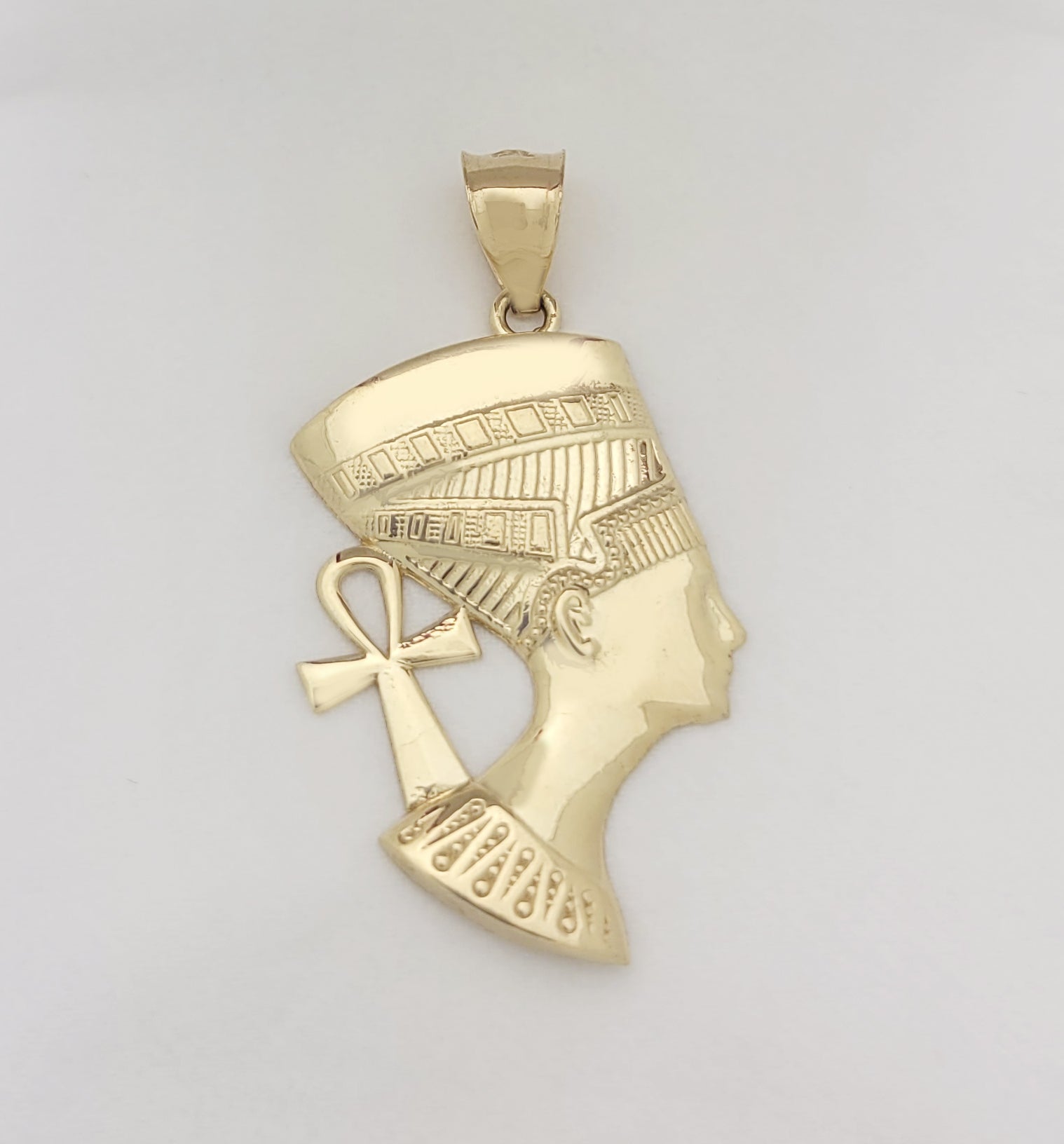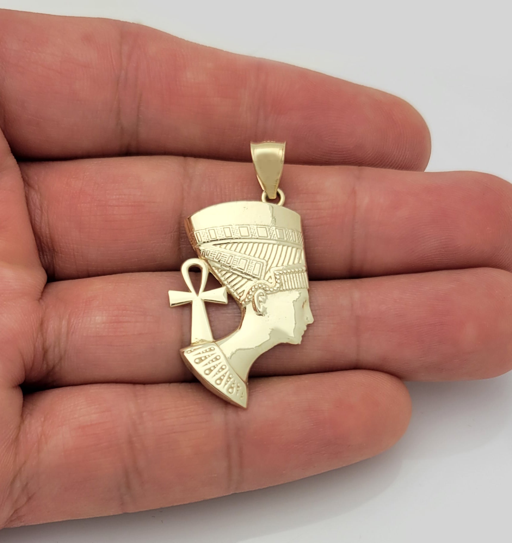 10K Yellow Gold Nefertiti Necklace Pendant Egyptian Queen With Ankh Cross