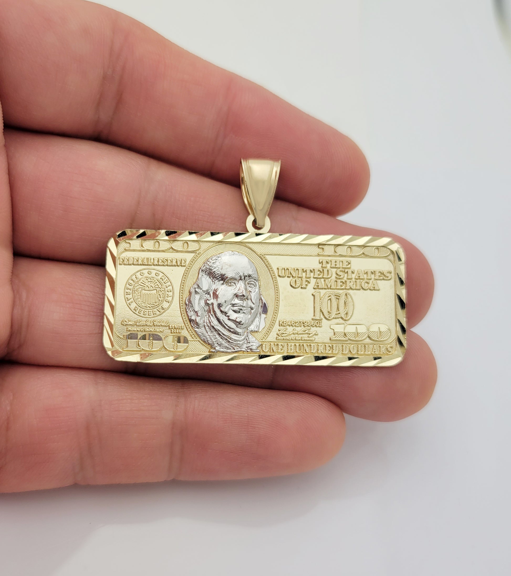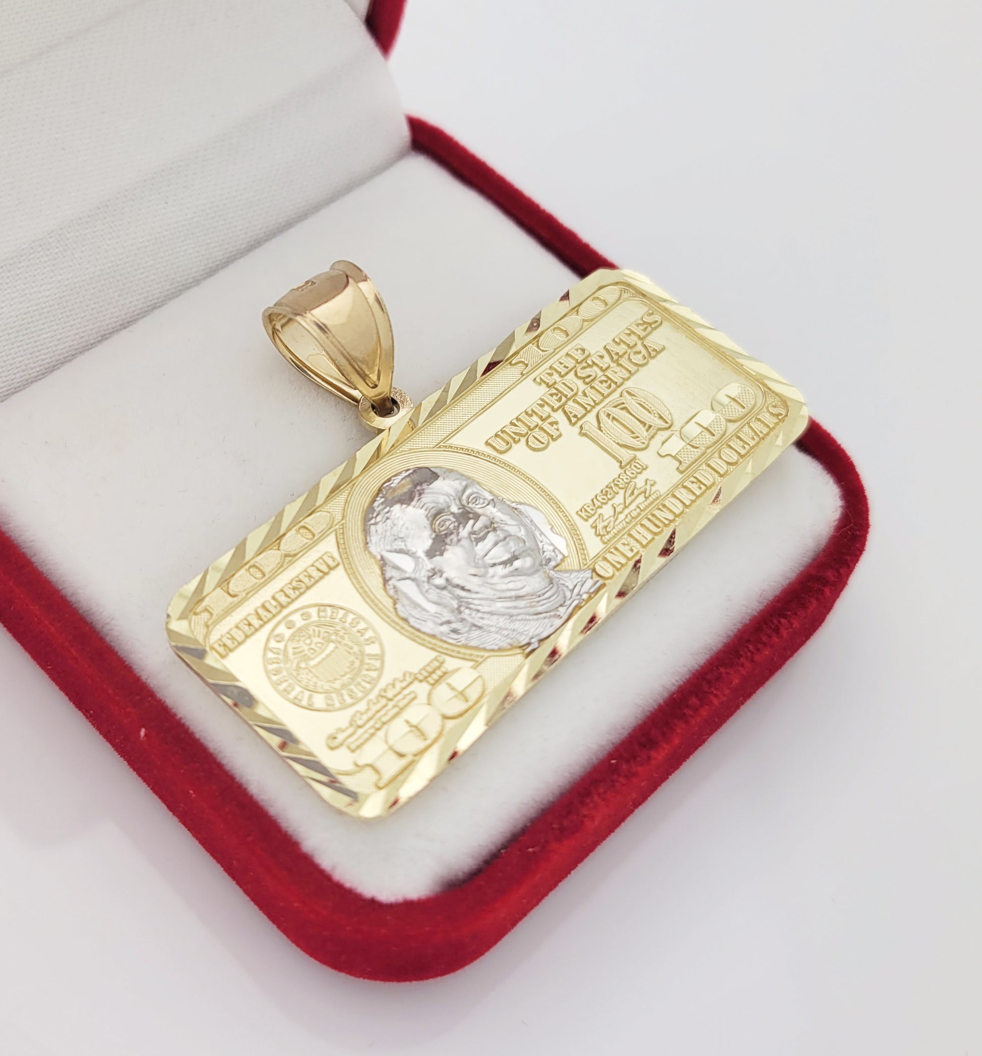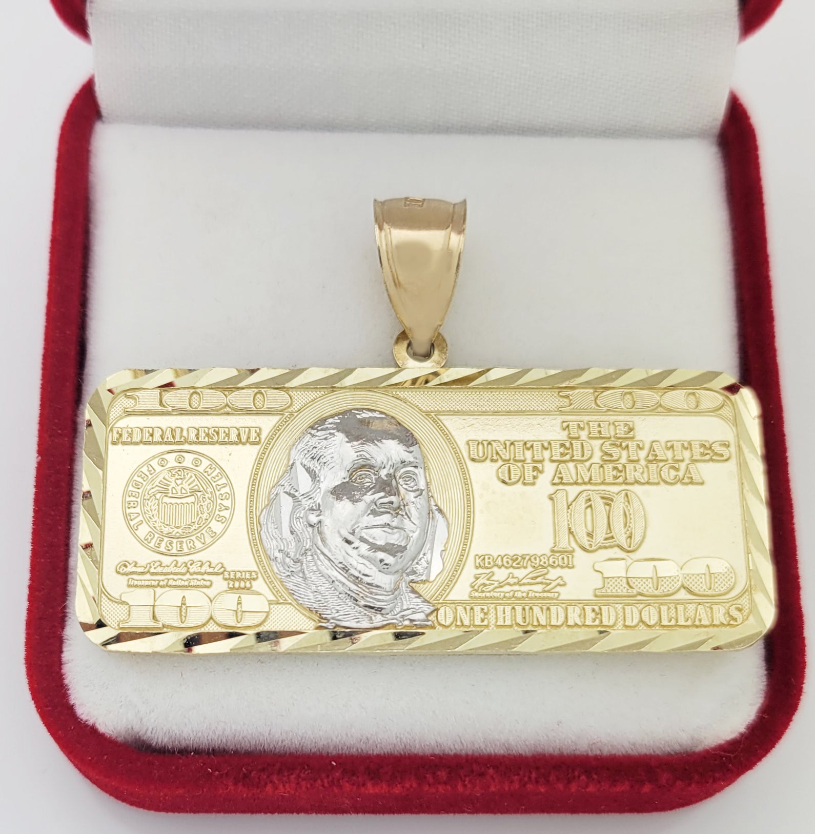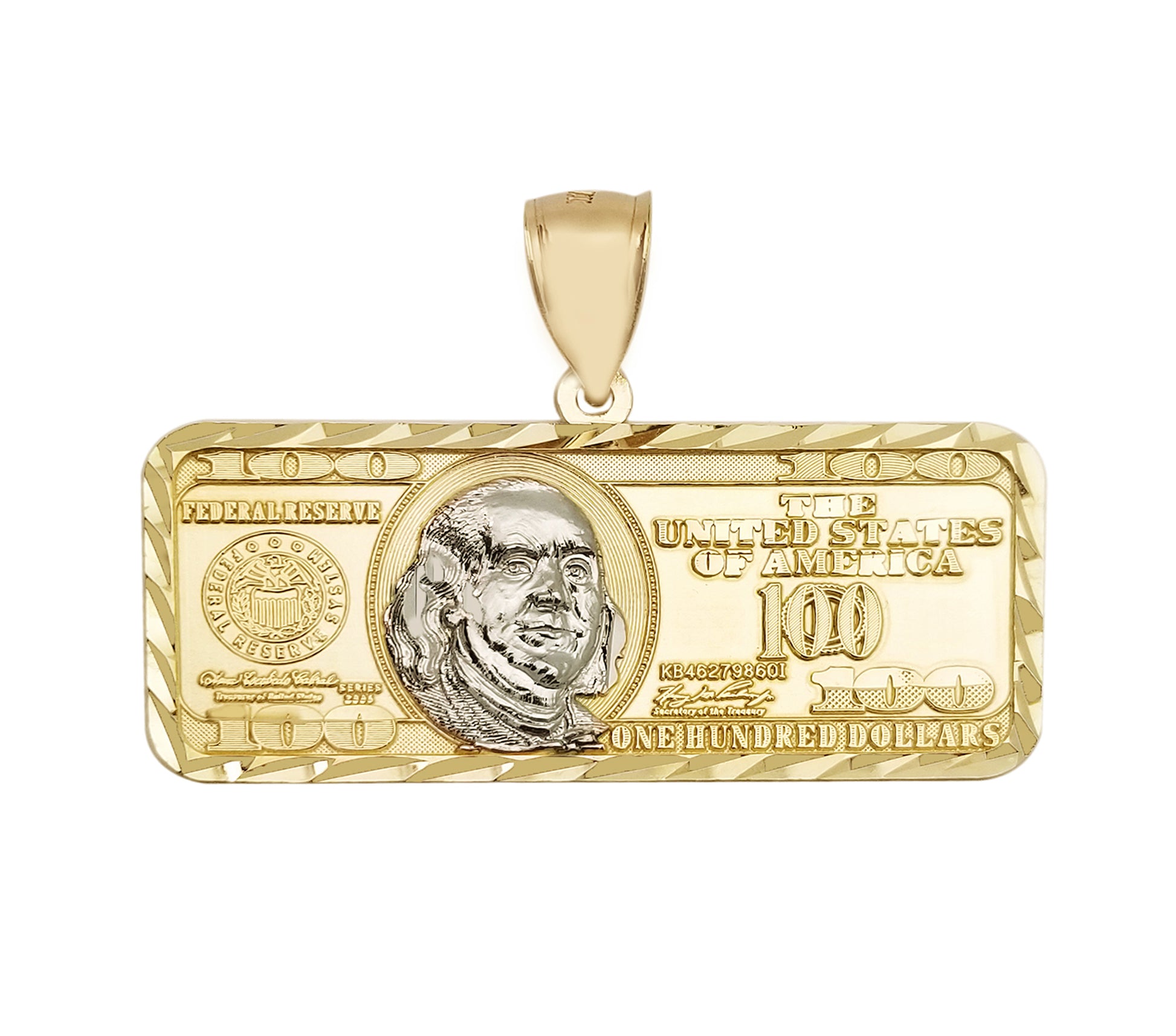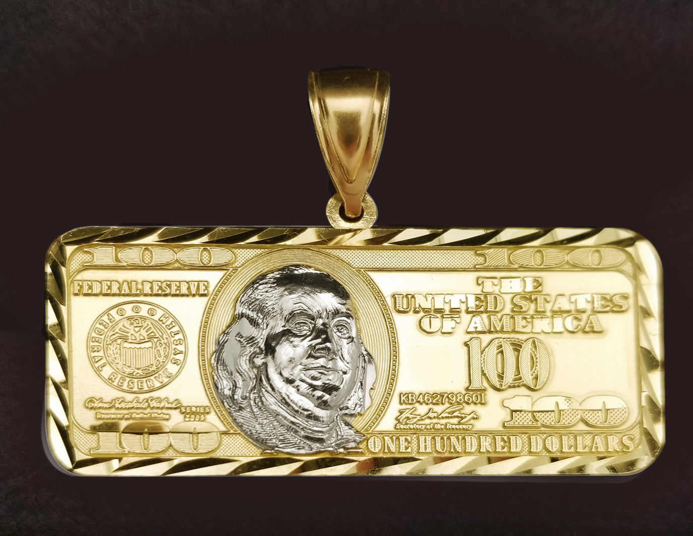 Mens 10K Yellow Gold Hundred Dollar Bill Pendant Benjamin Franklin