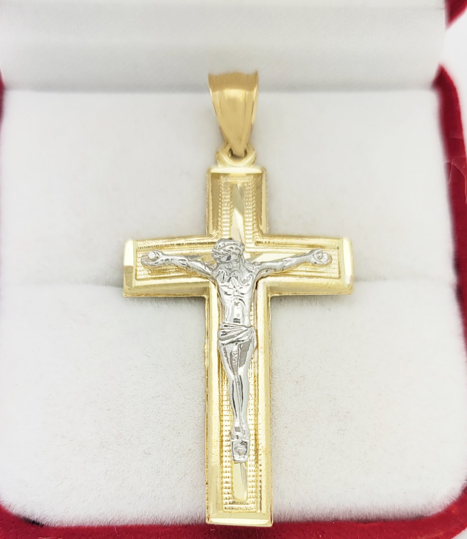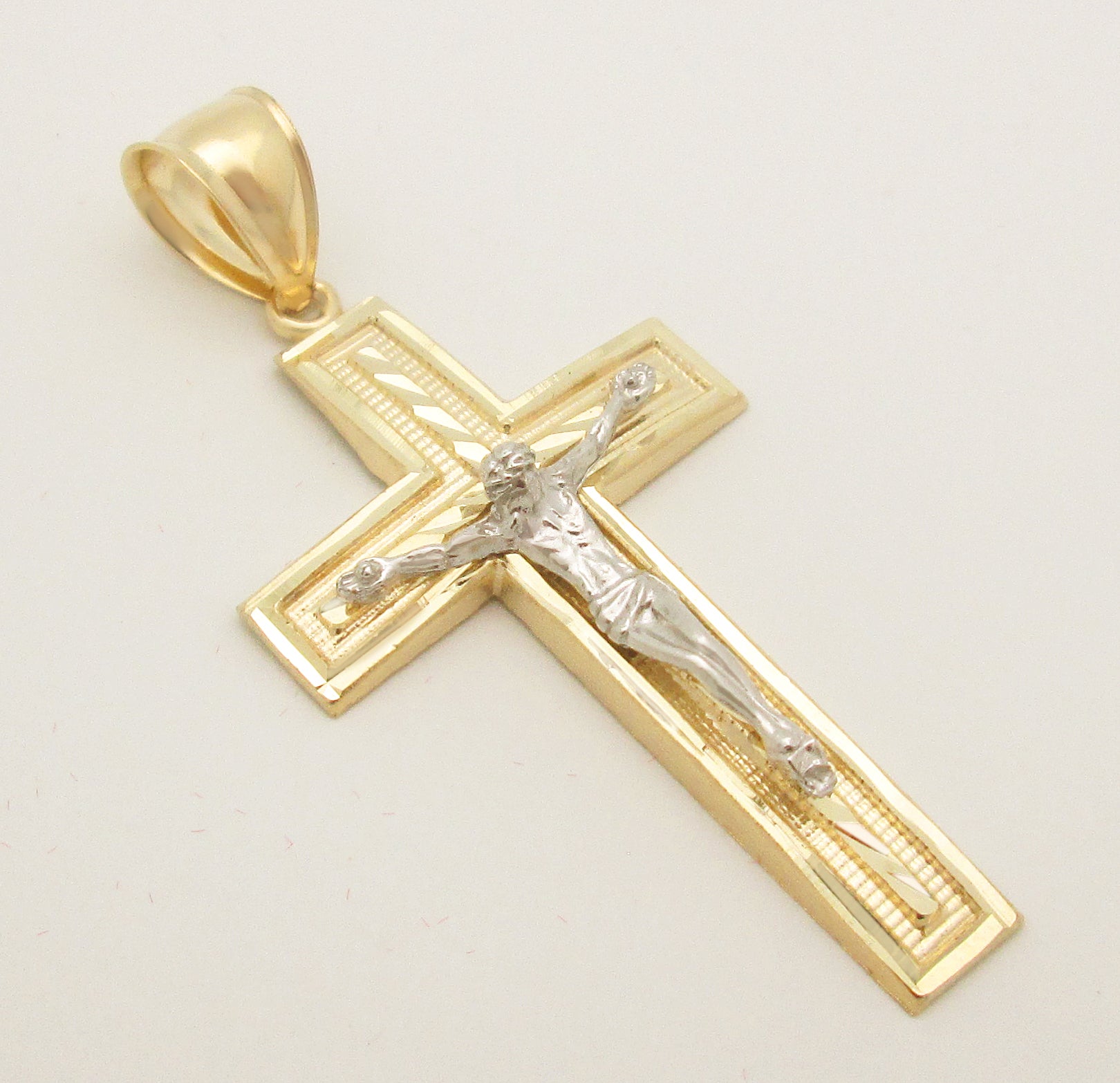 Mens 10k Yellow Gold White Gold Two Tone Cross Pendant Diamond Cut 2.1 inch